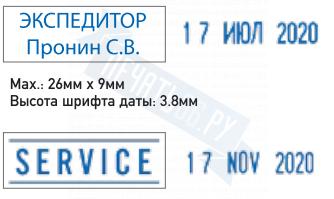 Поле: 26 х 9 мм, высота даты: 3,8 мм. Со встроенной окрашенной штемпельной подушкой синего цвета.